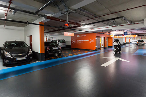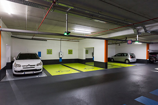 Le parking dispose de trois niveaux souterrains, où les clients peuvent facilement trouver des places de stationnement pour des personnes à mobilité réduite, des familles, des places avec bornes de recharge pour les voitures électriques et même un point de rencontre pour les covoiturage. Les allées sont particulièrement larges et les accès sont clairement identifiés afin que les clients puissent se déplacer facilement.
